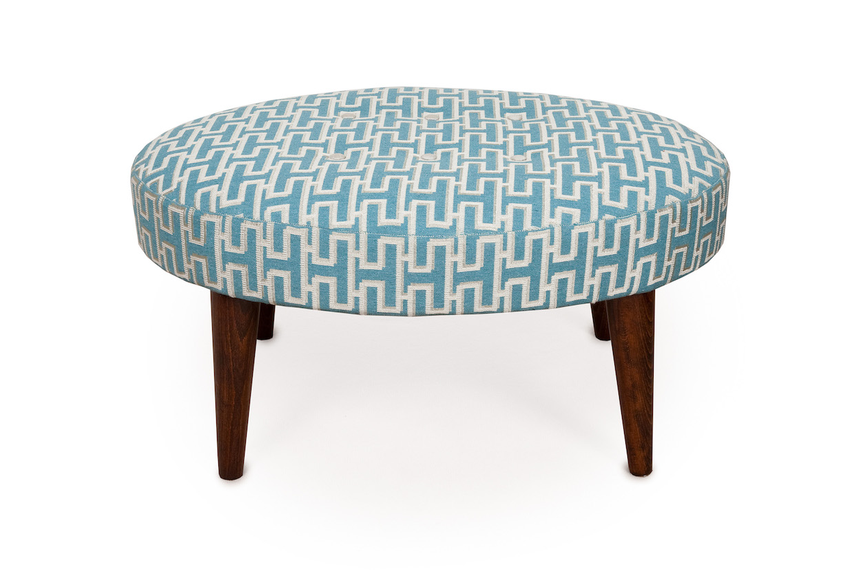 The price shown includes hardwood frame with the legs and colour wood of your choice, and materials including pom poms, braid or gimp, double piping application, bottom fabric border and up to ten float buttons (covered in your fabric).