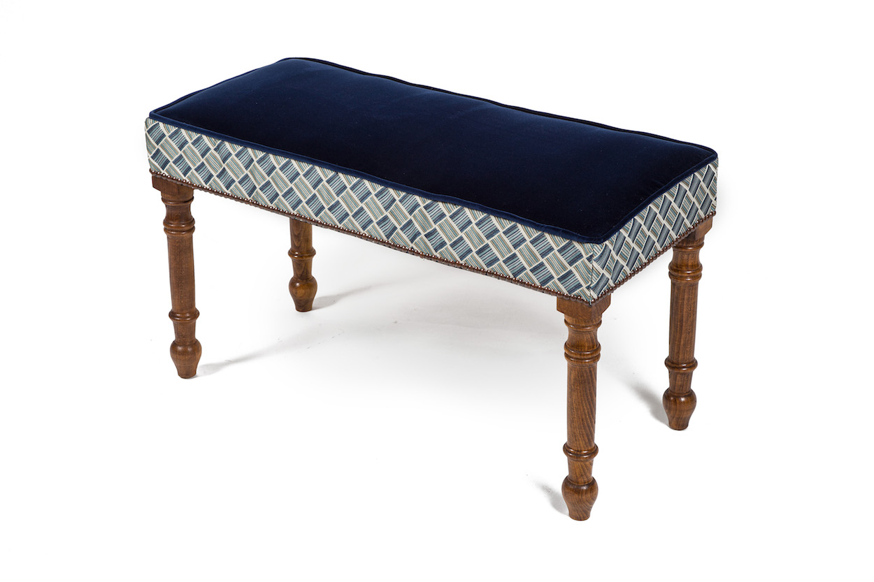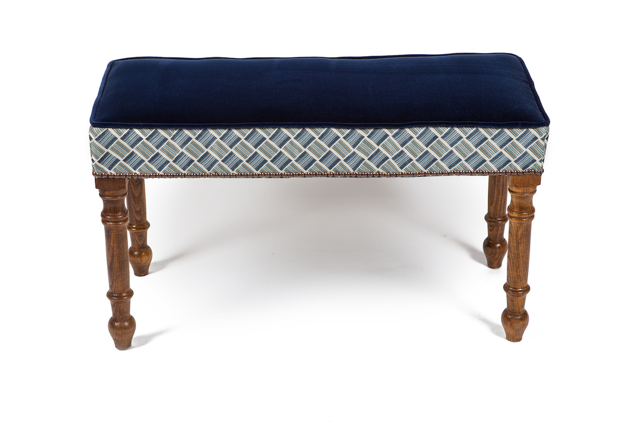 The price shown includes hardwood frame with the legs and colour wood of your choice, and materials including pom poms, braid or gimp, double piping application, bottom fabric border and up to ten float buttons (covered in your fabric).