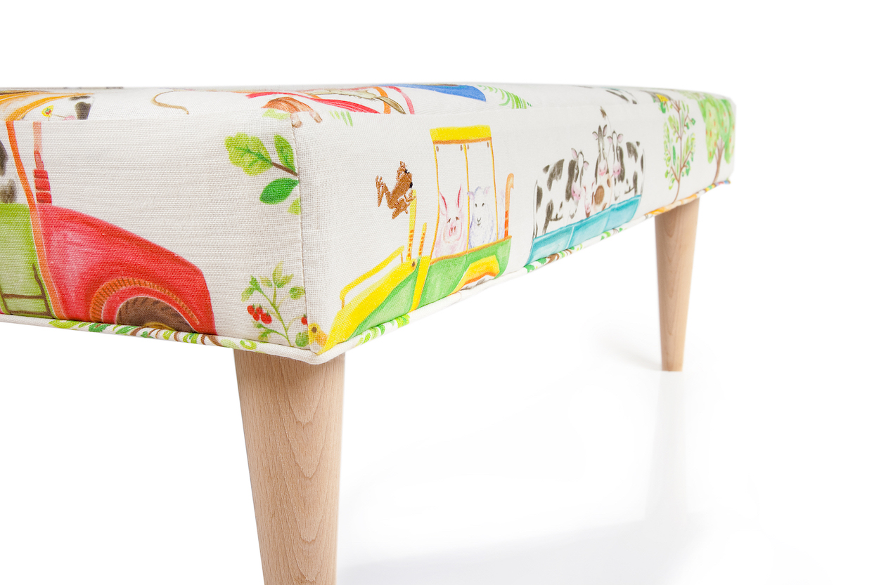 The price shown includes hardwood frame with the legs and colour wood of your choice, and materials including pom poms, braid or gimp, double piping application, bottom fabric border and up to ten float buttons (covered in your fabric).